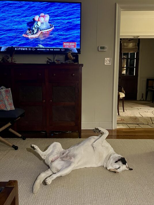 AND NOW (after all these months!) what has moved me to write again is the awe and wonder I am still experiencing as I continue to obsess over the Artemis II Moon Mission. Like so many of you, I was glued to the television as the module containing those astronauts made its re-entry into our atmosphere and then safely splashed down in the Pacific Ocean. My husband and I held our collective breaths and then erupted into unprompted cheers—our arms raised—as confirmation came all was well. The last of the four, Captain Reid Wiseman, had stepped out of the capsule and like the other three, Pilot Victor Glover, Mission Specialist Christina Koch, and Mission Specialist Jeremy Hanson, was in good health and good spirits.